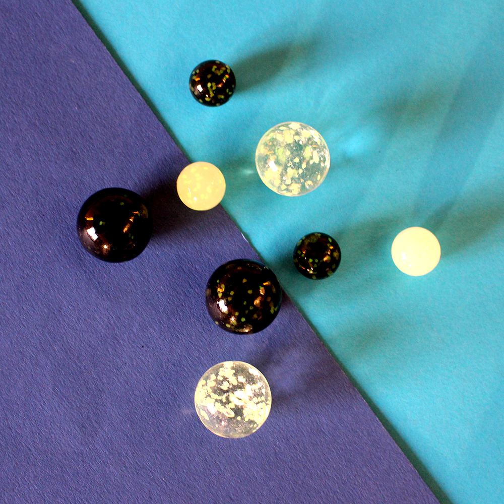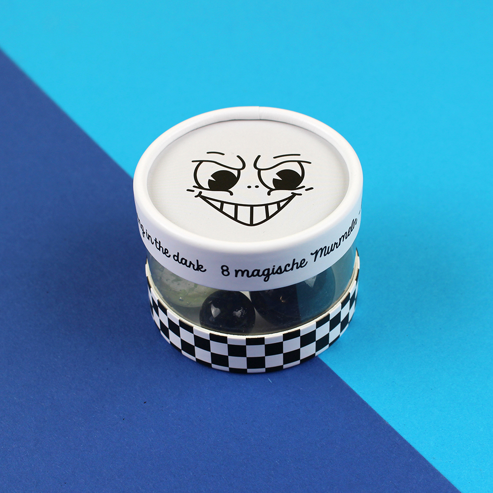 Magische Murmeln, schwarz/weiss – Glow in the Dark, 8 Stück in runder Geschenkverpackung