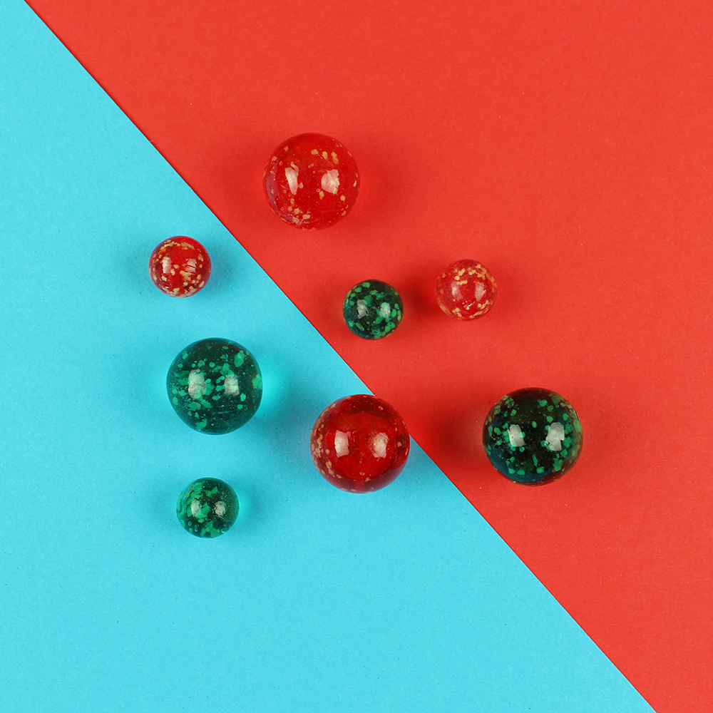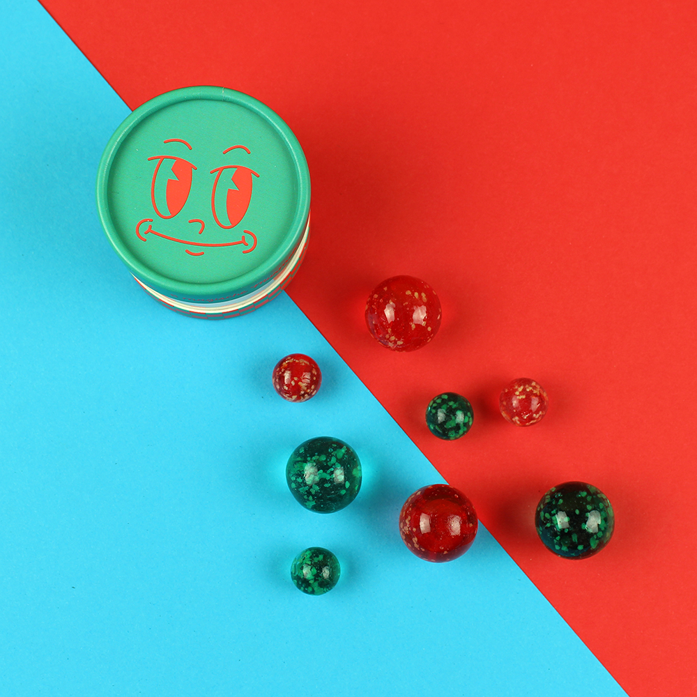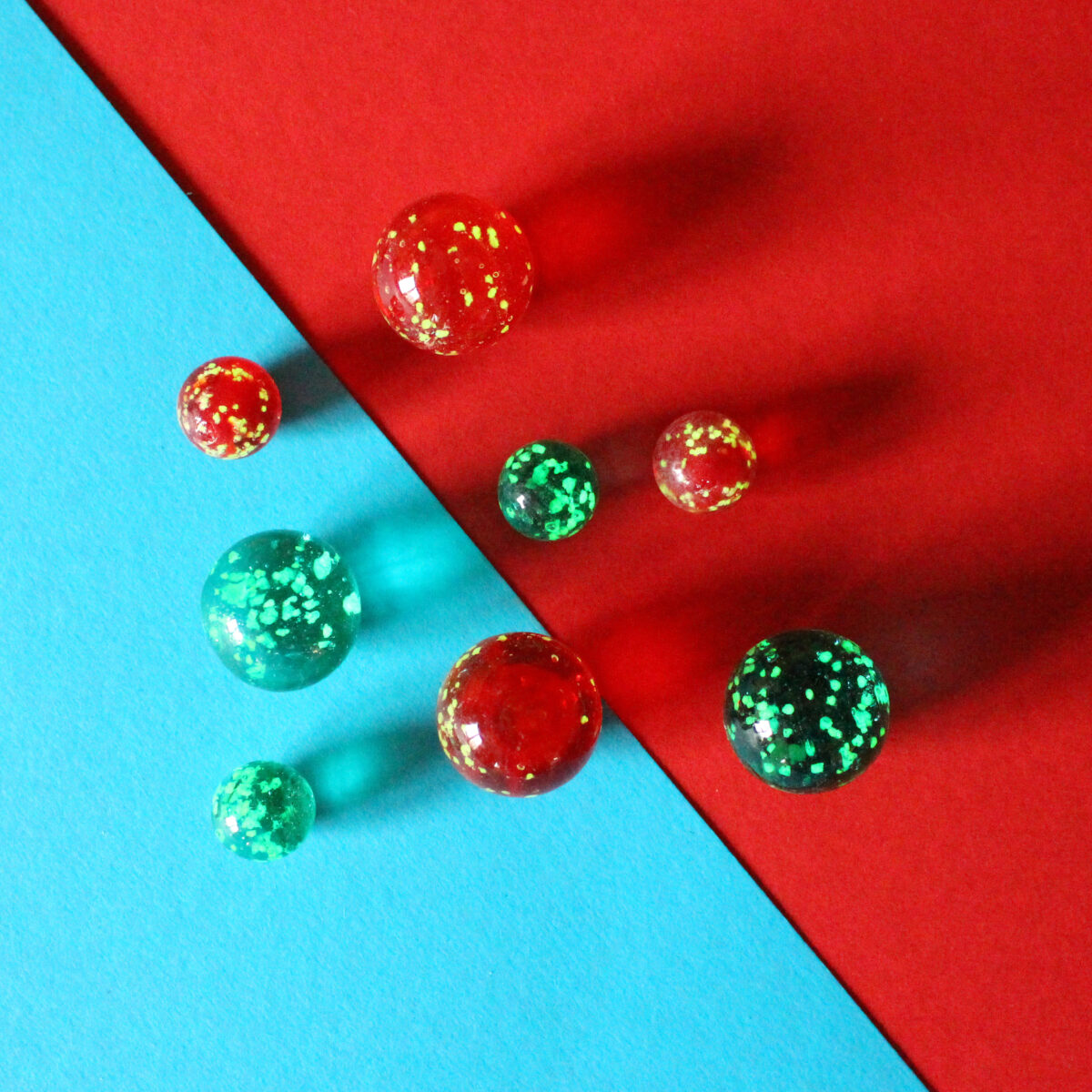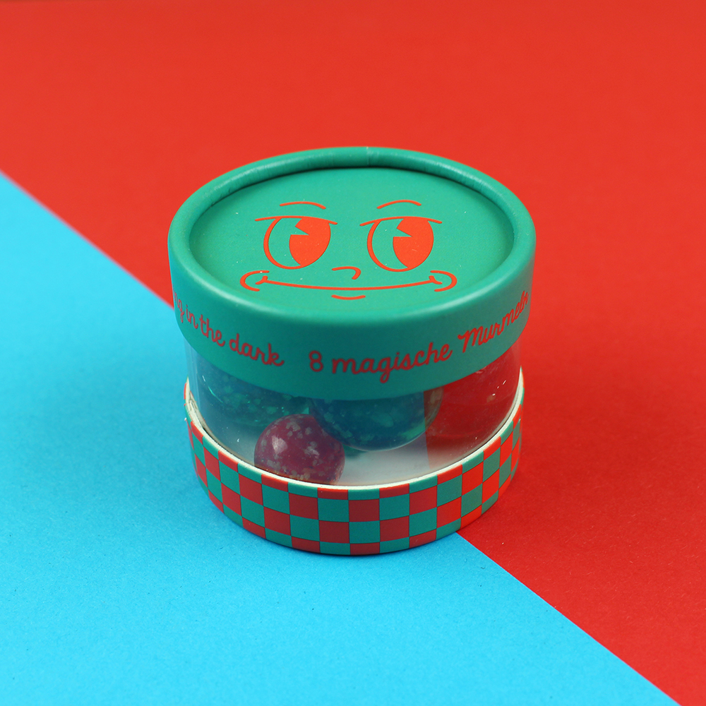 Jedes Set besteht aus 4 grossen (25mm) und 4 kleinen (16mm) handgefertigten Murmeln, die im Dunkeln leuchten. Jeweils 2 Farbkombis in einem Set.