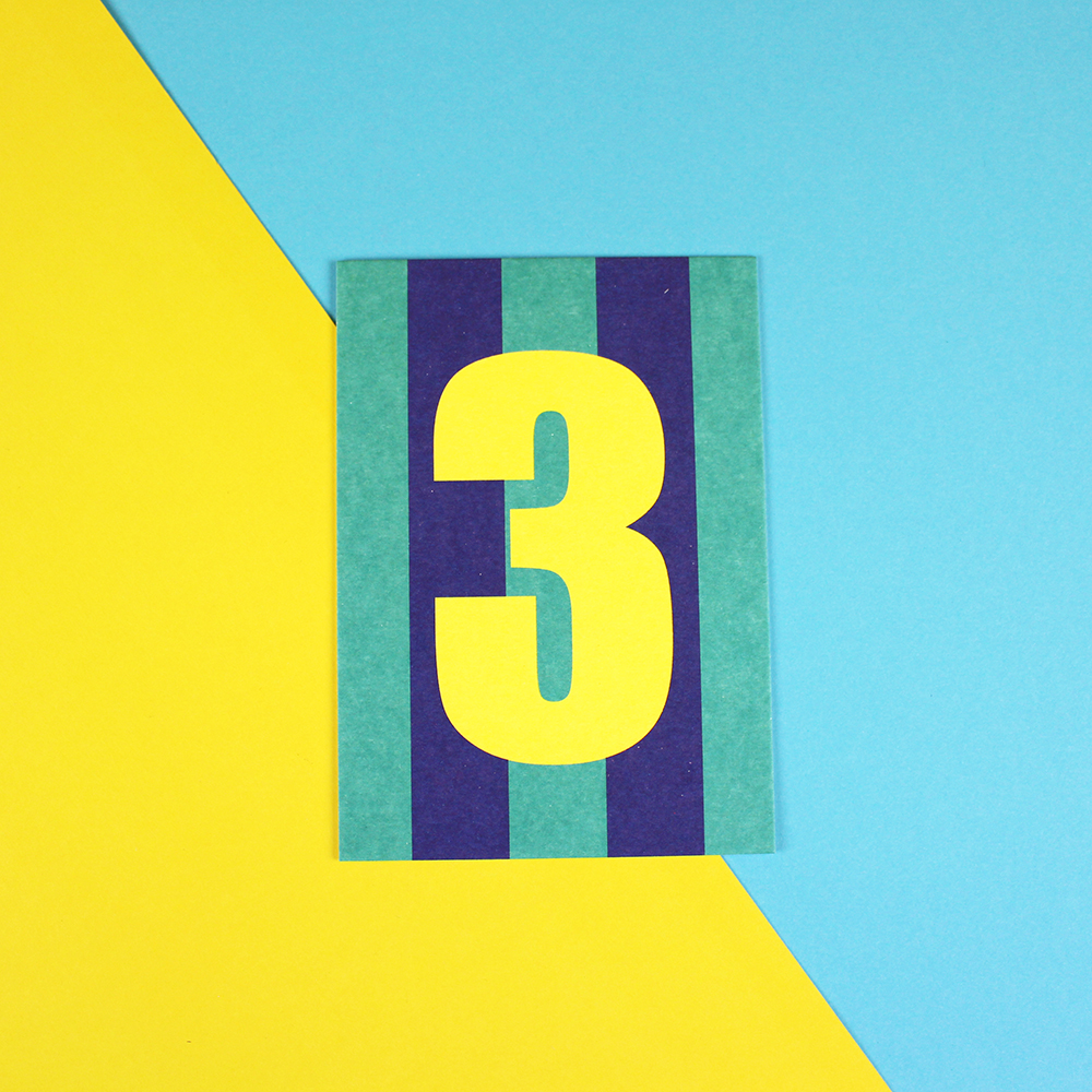 Postkarte Zahl 3, blau/mint, Neon Gelb