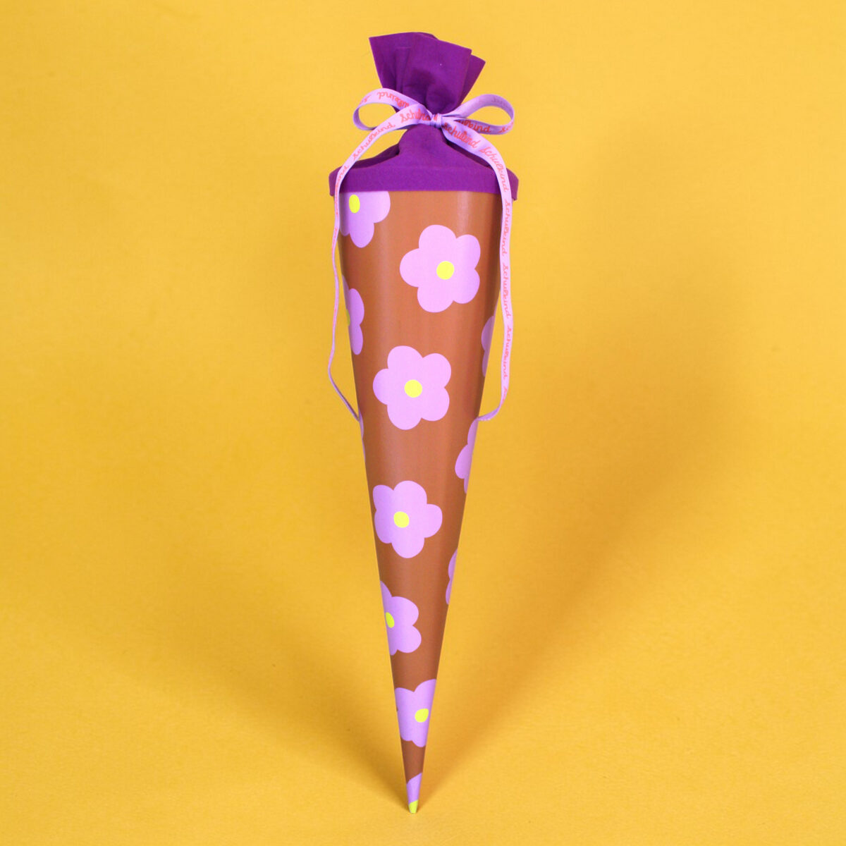 Schultüte ocker mit großen rosa Blüten und lila Filzverschluss, 70cm